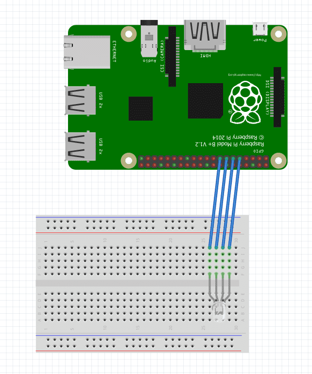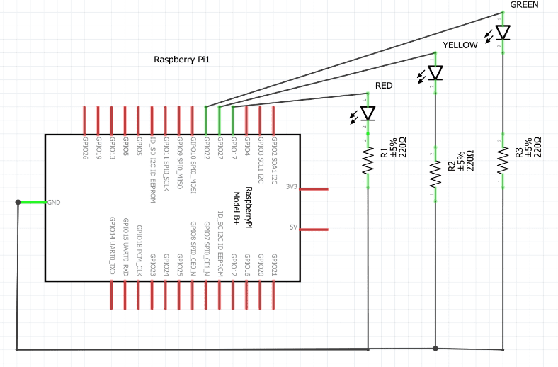 - Once you have your server up and running, you are ready to get your GPIO pins wired up and ready to go. This can be done using the following diagrams (remember, the lights in these diagrams have resistors built into them and that is why they are not on the layout diagram but still show up on the logical one. For the sake of the diagram, the fancy 4-pronged light represents a component that has 3 resisted lights on it and a ground pin all on a integrated board.