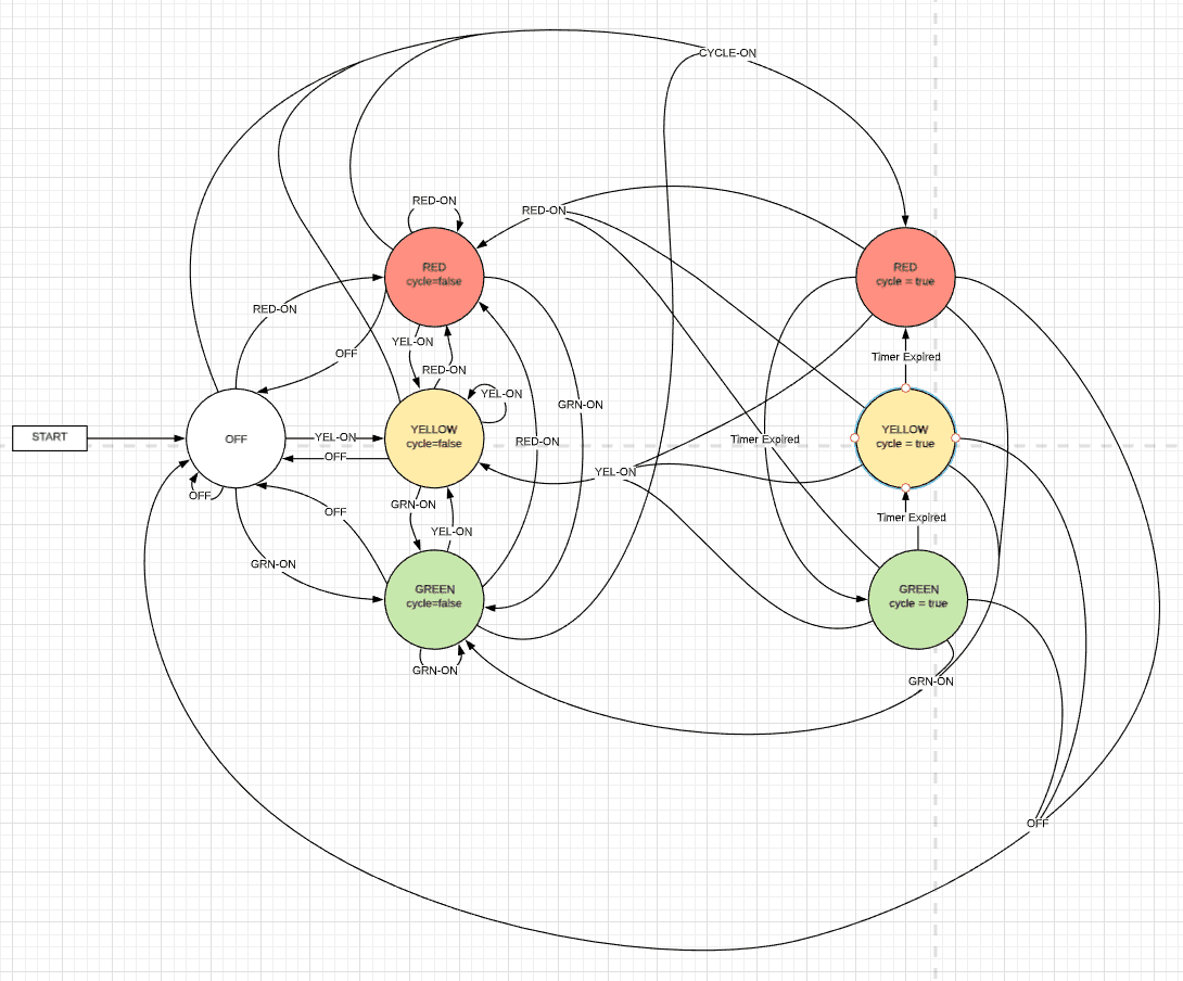 - The way these two diagrams talk is that whenever the cycle-on signal is triggered, the lights are turned off and the start point of the cycle is triggered. Whenever any other action is taken, it will then transition back to that state. Here is what the diagrams together look like.