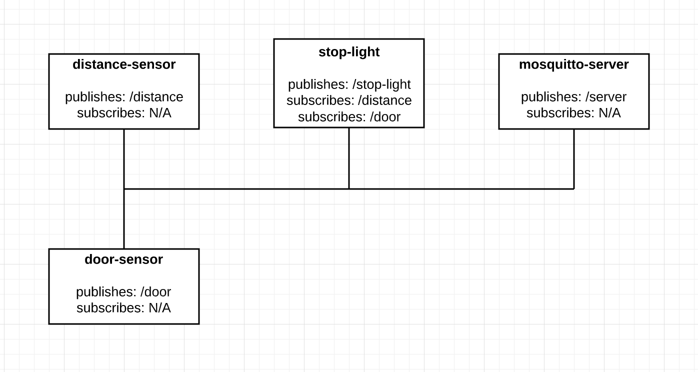 - The stoplight should subscribe to the topic for the distance sensor and for the door sensor. This way, it will be able to know when there are changes and change accordingly.